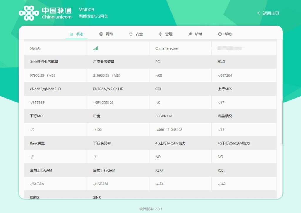 - 下图为联通VN009实际测速,频段为78,中国电信